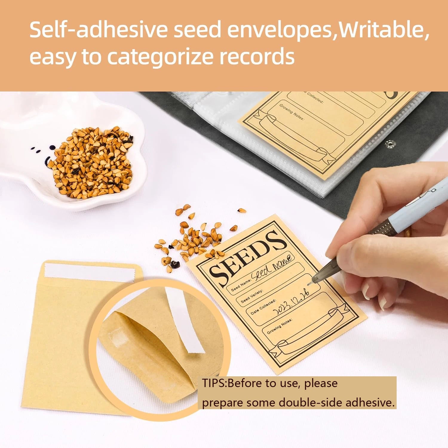 Easy to Use:Our seed envelope has a self-adhesive seal, and you can record important information on the envelope, such as seed type, variety, collection date, etc. Then put the seeds into an envelope bag and put them into the seed storage box to complete the saved seed storage.